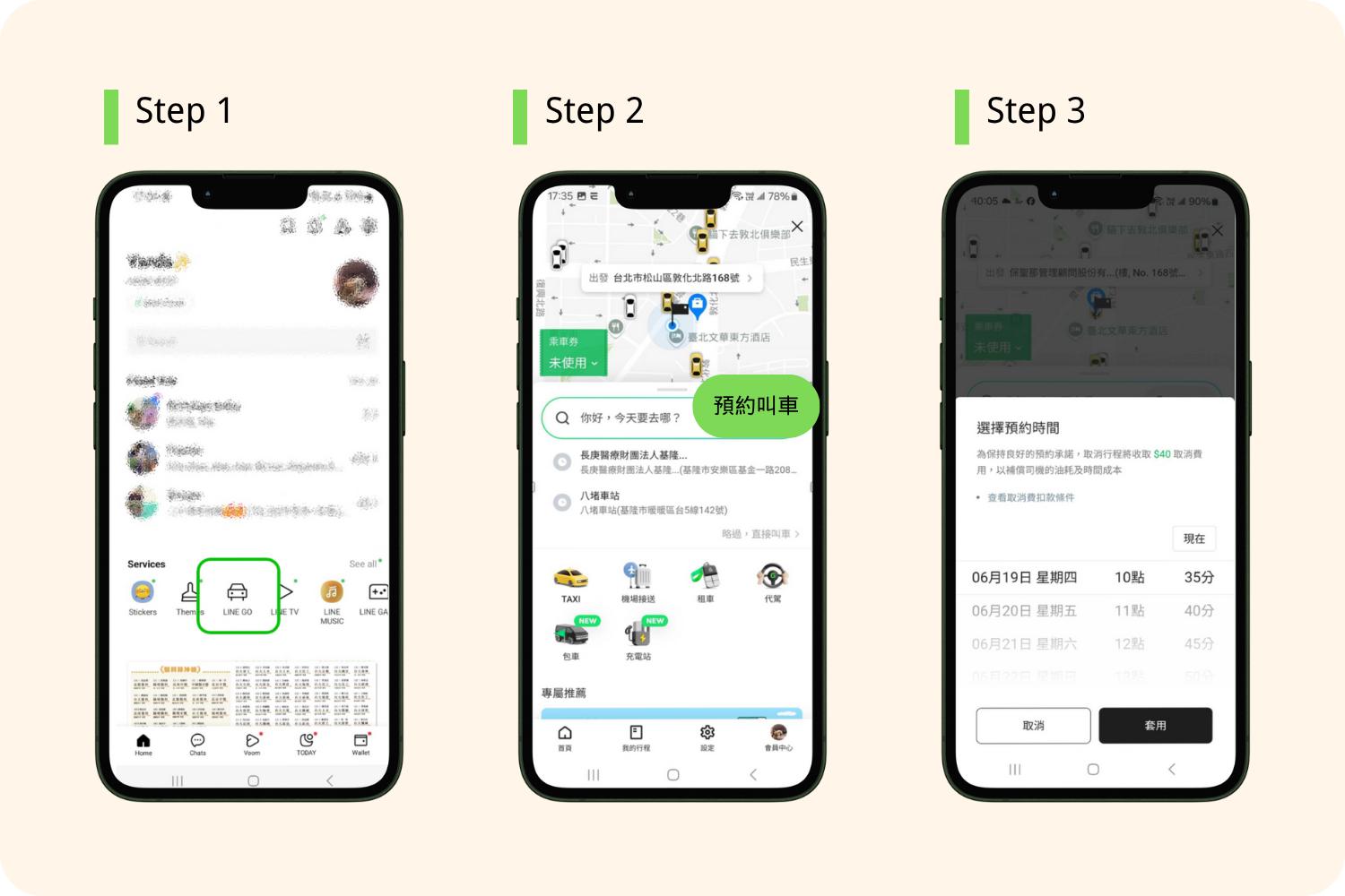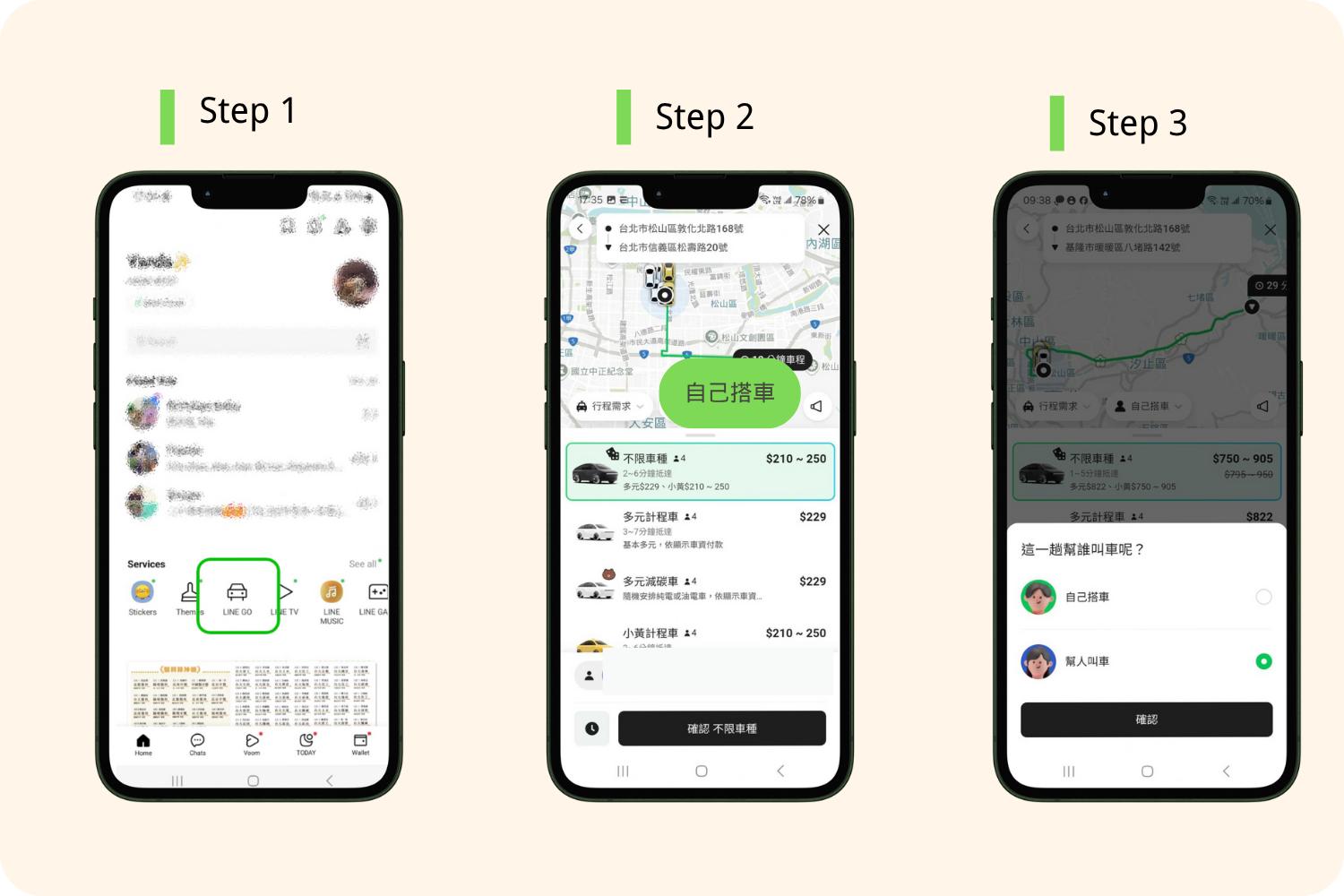 無論是幫爸媽安排出門的車、幫同事叫車趕會議,還是幫朋友接送跑行程,用 LINE GO 設定幾個步驟,就能輕鬆搞定。