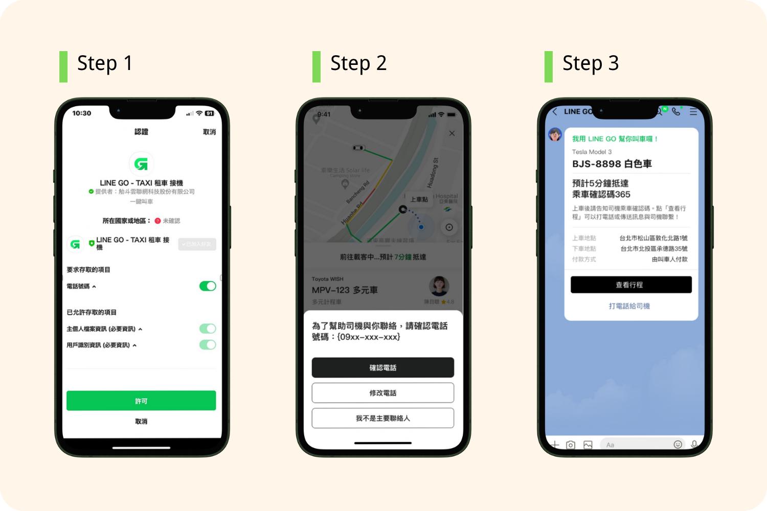 收到訊息後,只要同意LINE隱私條款,並完成聯絡電話設定就能看到完整的行程資訊,像是上、下車地點、預估抵達時間、車號等,也能直接進入聊天室,與叫車人或司機聯繫。