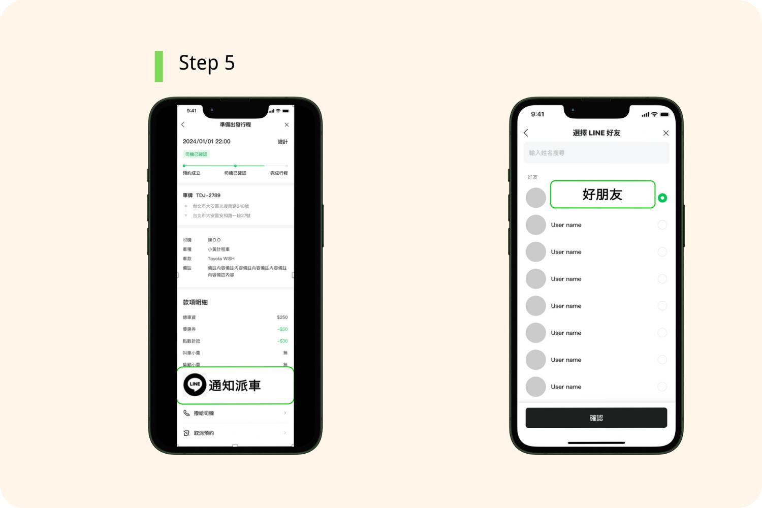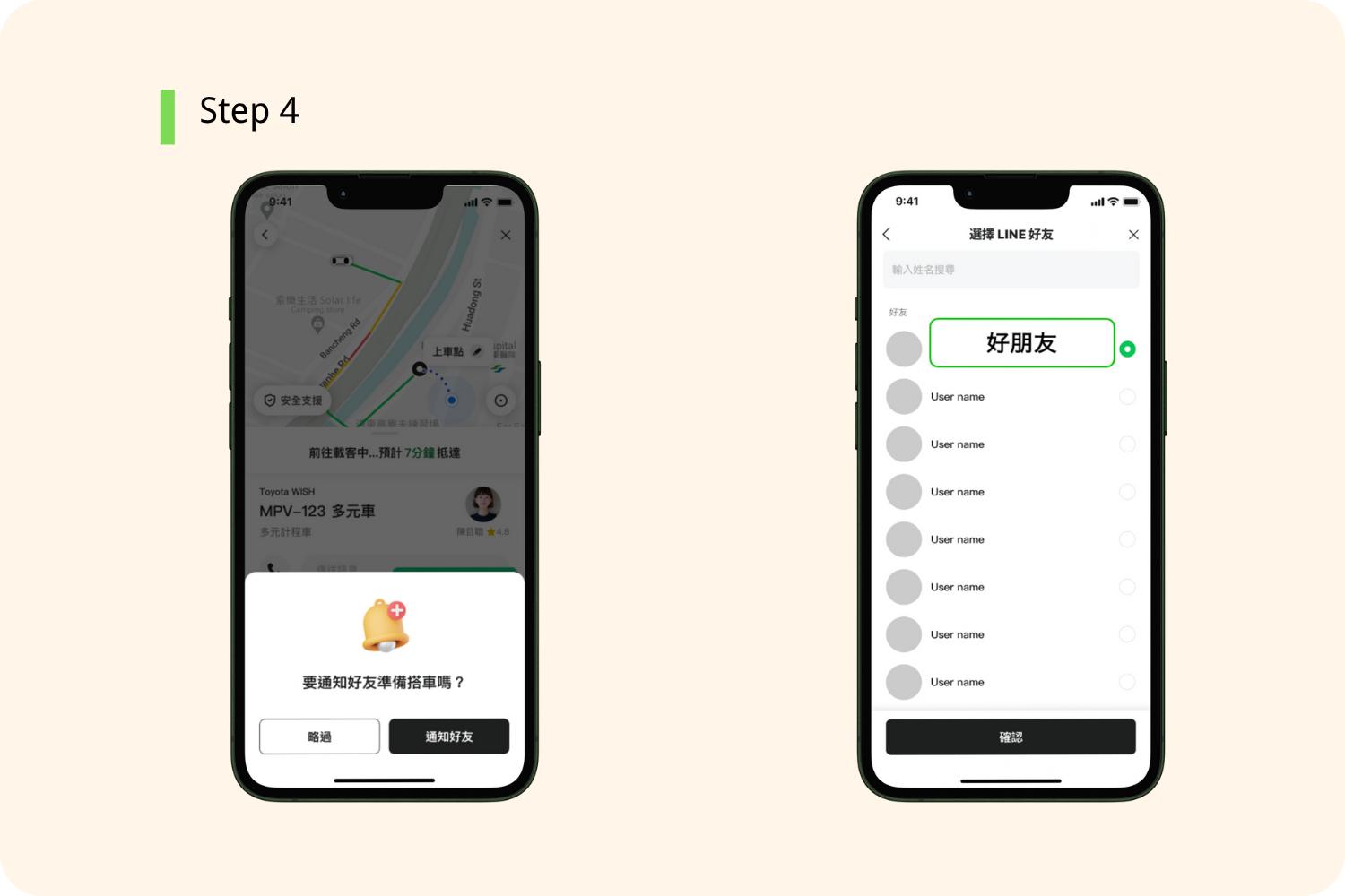 Step 5: 當媒合到司機後,即可通知好友搭車。