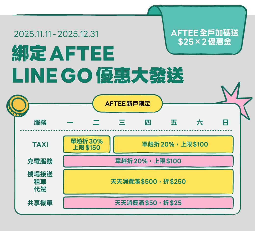 🎁 活動期間註冊 LINE GO 新用戶 ,立即領取 $1,200 新戶大禮包外,綁定 AFTEE 支付,優惠折上折!