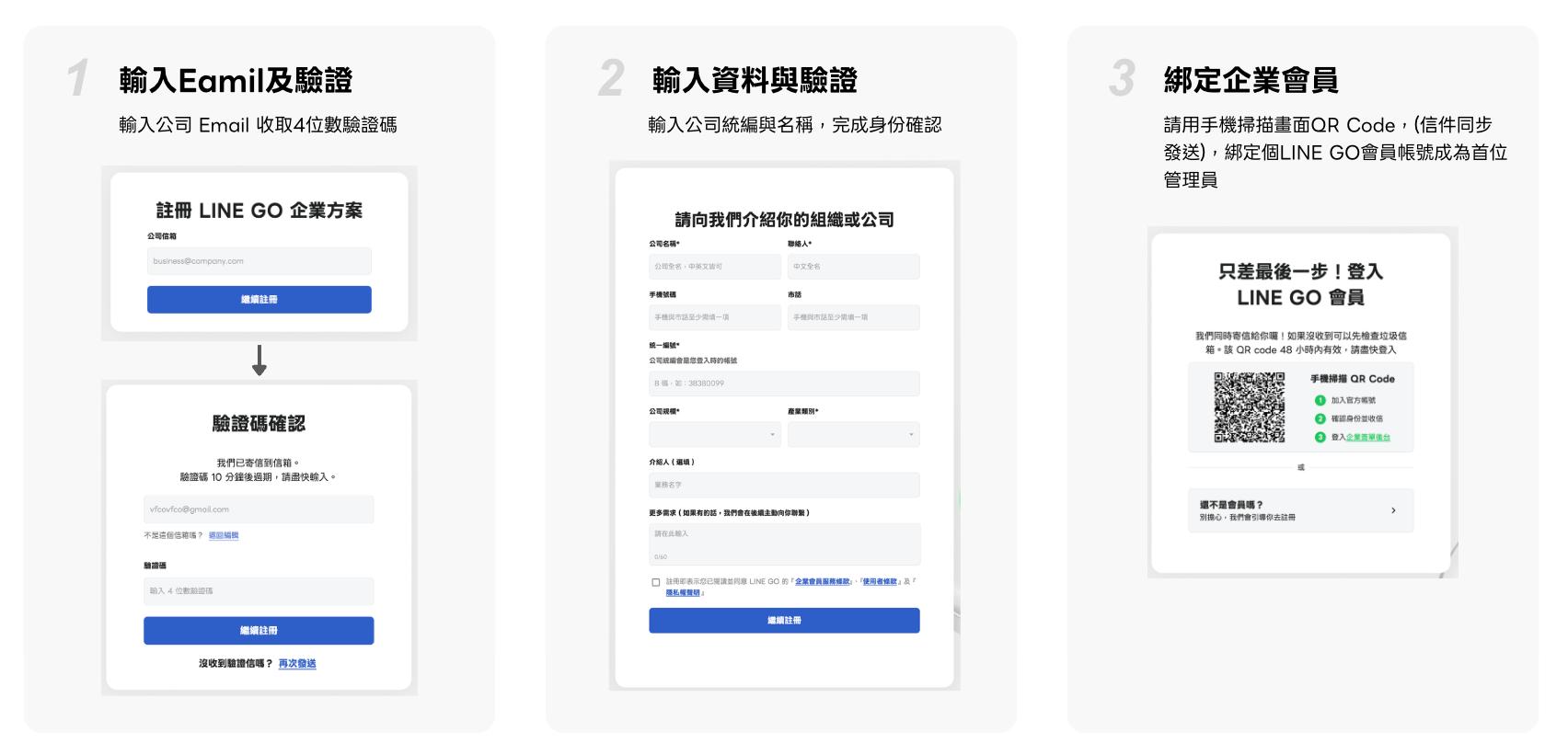 前往註冊頁面,輸入您的公司統編與企業信箱,收取驗證碼完成初步認證