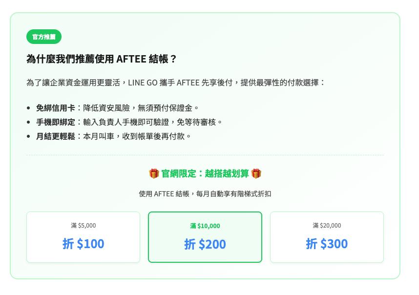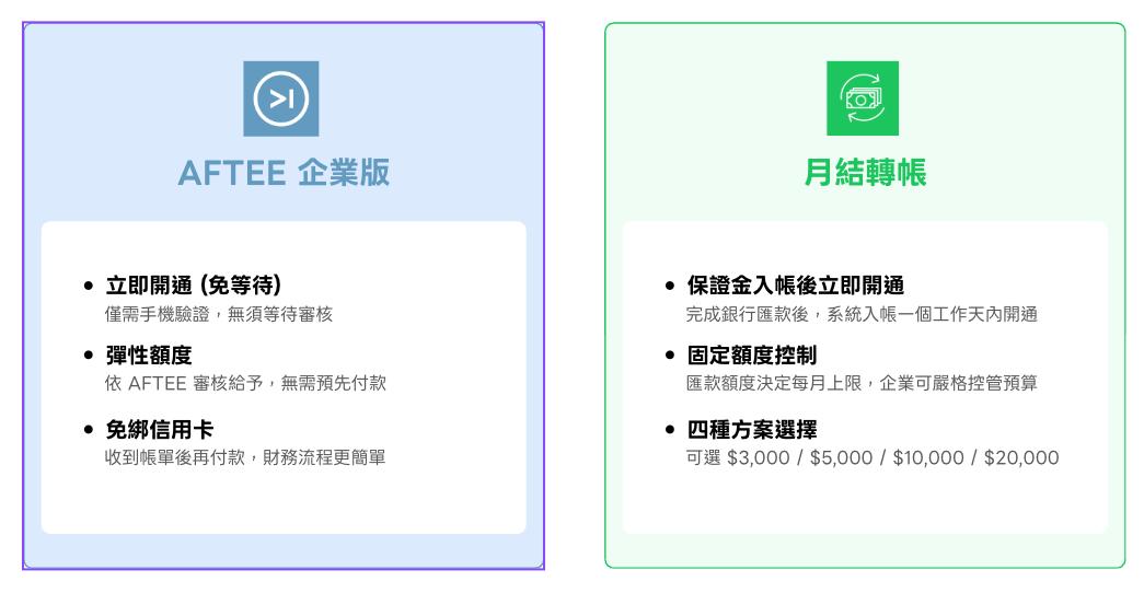 這是最重要的一步!您可以選擇「月結匯款保證金」或我們強烈推薦的「AFTEE 企業版」。