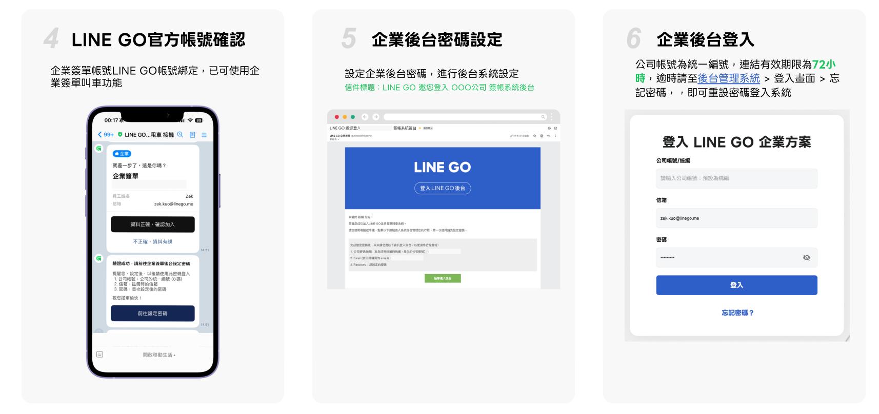 現在,無論您的公司規模大小,免簽約、免審核、0 門檻,只要有統編,3 分鐘就能線上啟用專屬的企業管理後台!