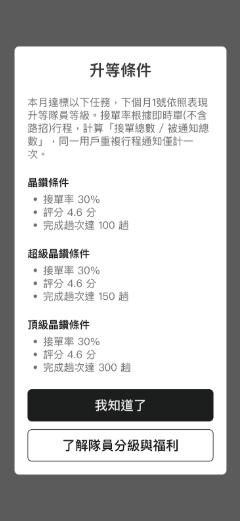 ▶ 「優質接單表現」福利制度:依前月接單表現,決定隔月隊員等級及福利, 將於每月1日凌晨2點更新於司機端App「隊員中心」