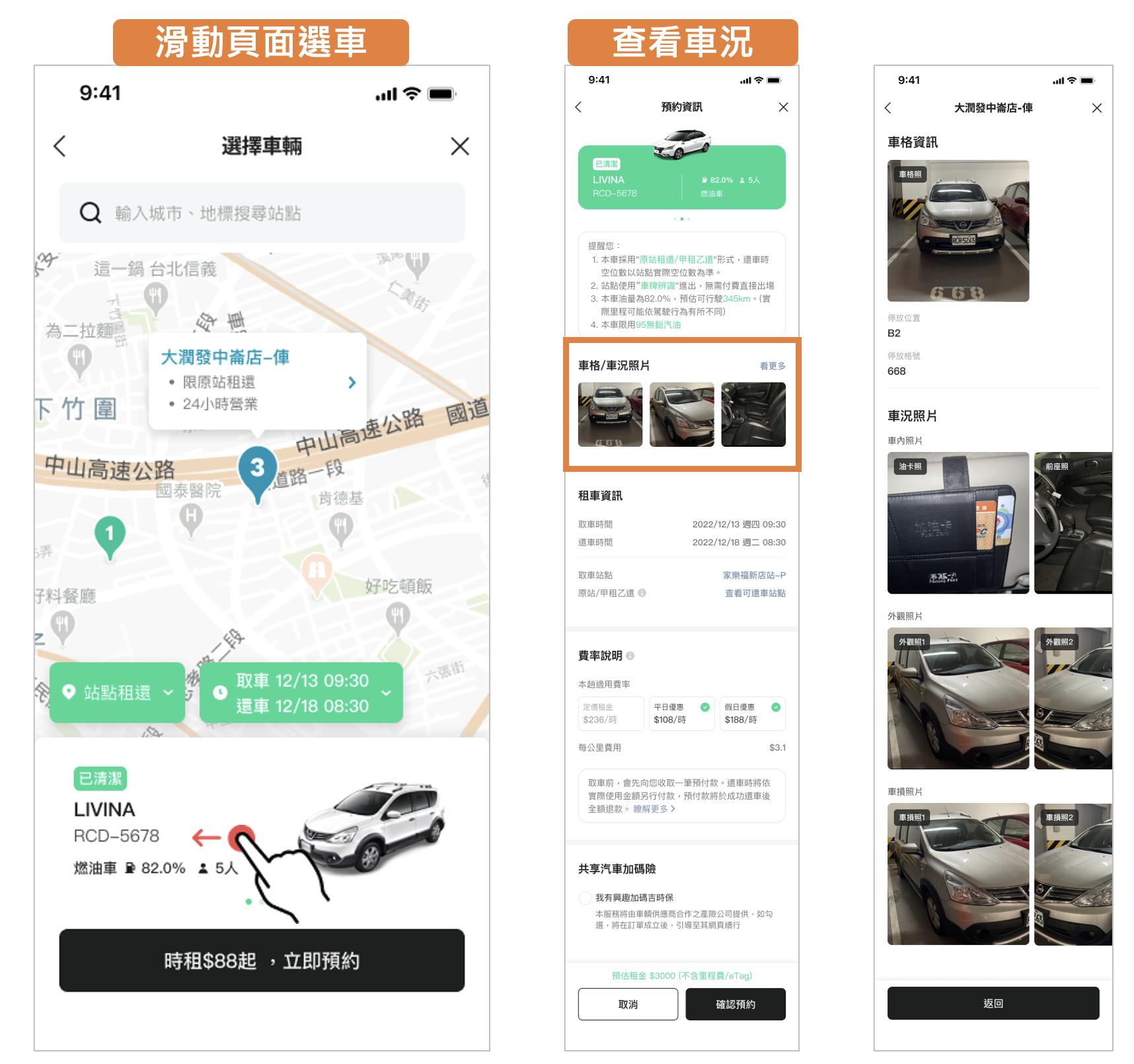 消費者可透過車內車外照片了解車況,依照需求選擇是否租用,取車時可領取租車金抵用券,可於當次交易使用,或於取券日的90天內使用。