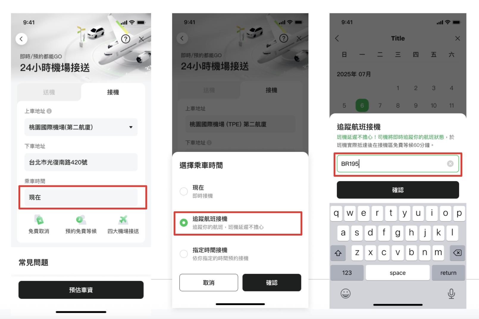 2.除了「即時接機」、「指定時間接機」外,也可選擇「追蹤航班接機」。(備註:追蹤航班接機模式,僅提供機場專車接機; 如欲搭乘一般計程車接機,請選擇「指定時間接機」)