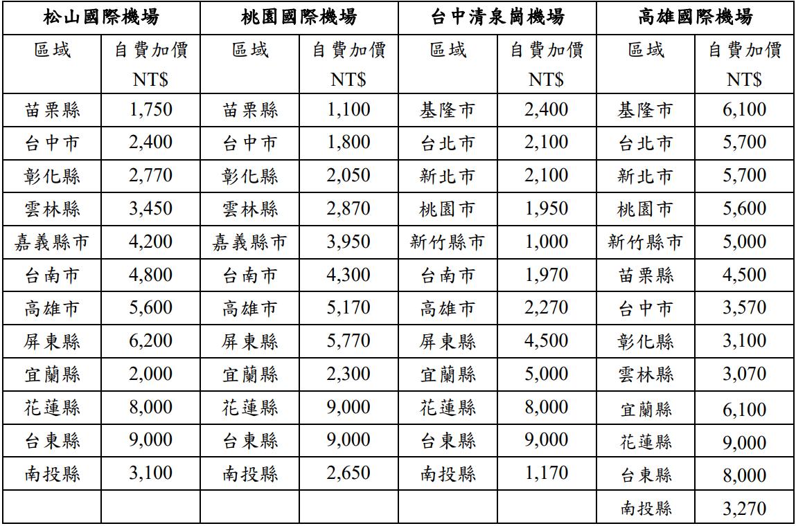 桃園國際機場 | 基隆市、台北市、新北市、桃園市、新竹縣市、苗栗縣、台中市、彰化縣、南投縣、宜蘭縣 | |