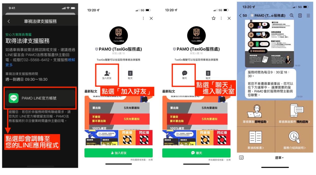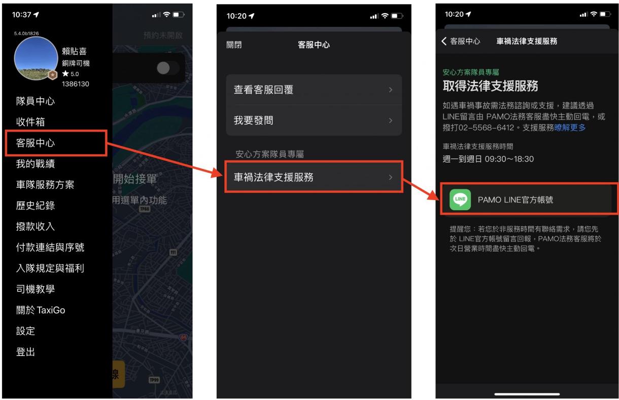 自2022.09.01起,若您為當月「車隊服務費-安心方案」之隊員,您將可透過 TaxiGo 司機端 APP 輕鬆連結至 PAMO 的 LINE 官方帳號 (TaxiGo 隊員專用),以快速取得車禍法律支援服務。