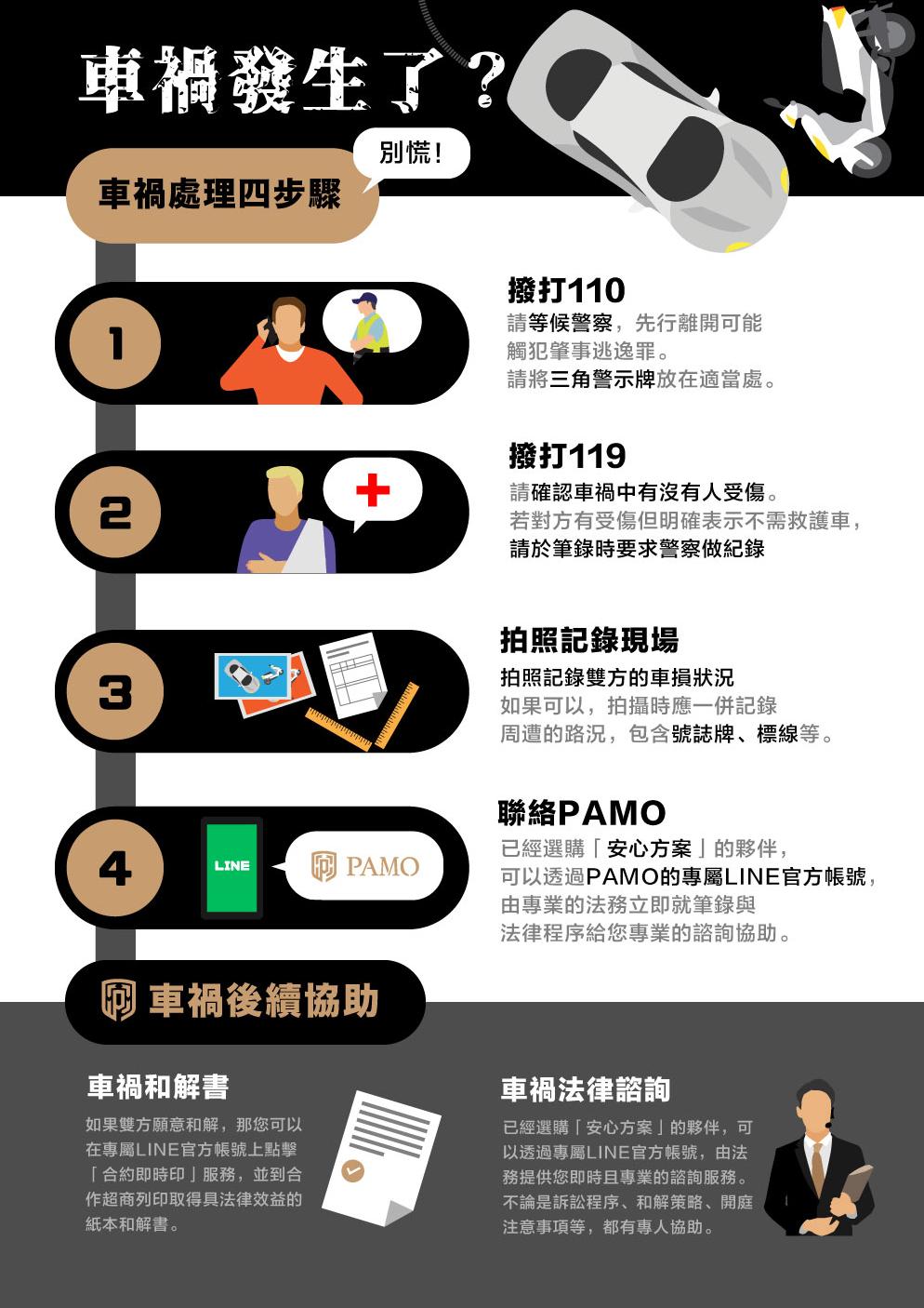 👉若發生車禍事故案件,請務必拍照紀錄現場情形,於「PAMO LINE官方帳號」回報車禍狀況(請參閱下方「車禍處理指引」),PAMO 法務夥伴將會於上午 10:00 前主動與您聯繫。