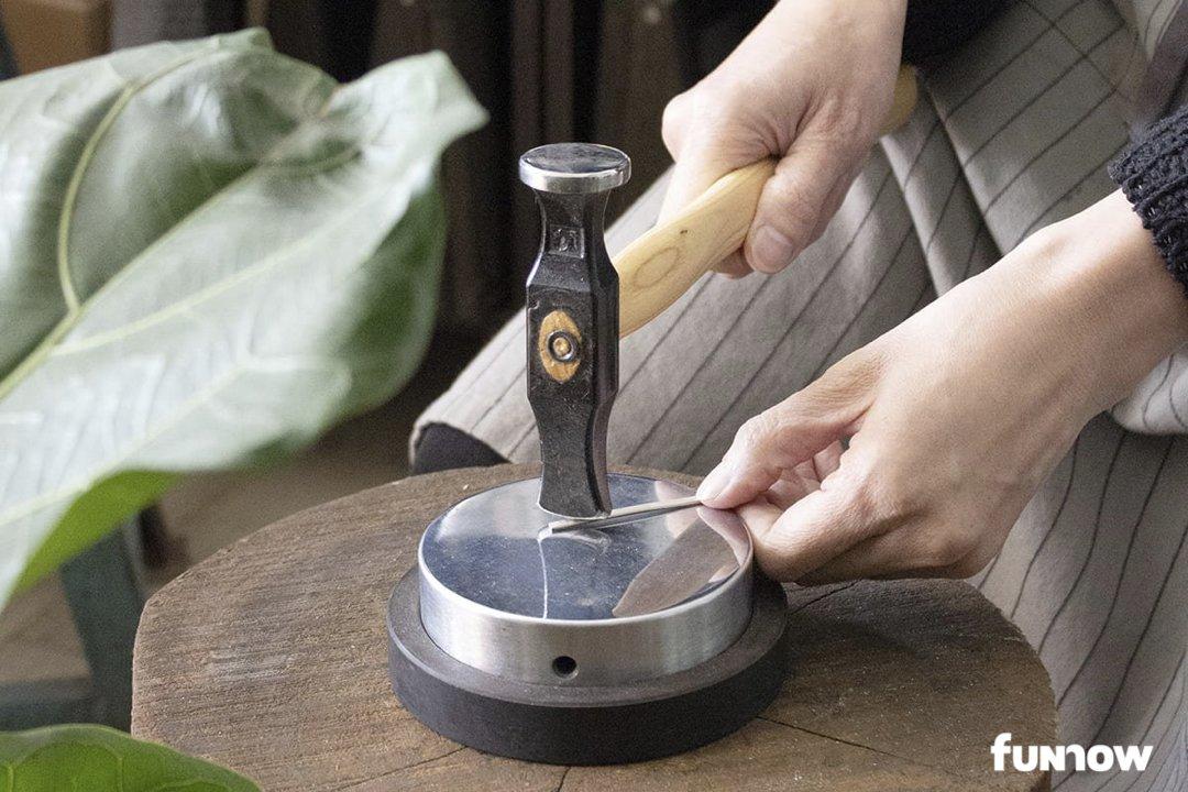 這時候就可以開始製作屬於自己的金工作品了~有的店家可以提供敲字服務,情侶們可以敲上彼此的名字,留下專屬回憶!敲完之後就是加熱、塑形與焊接、拋光的步驟了,是不是聽起來很難?但在老師的指導下可是很簡單的,你一定要來試試看!
