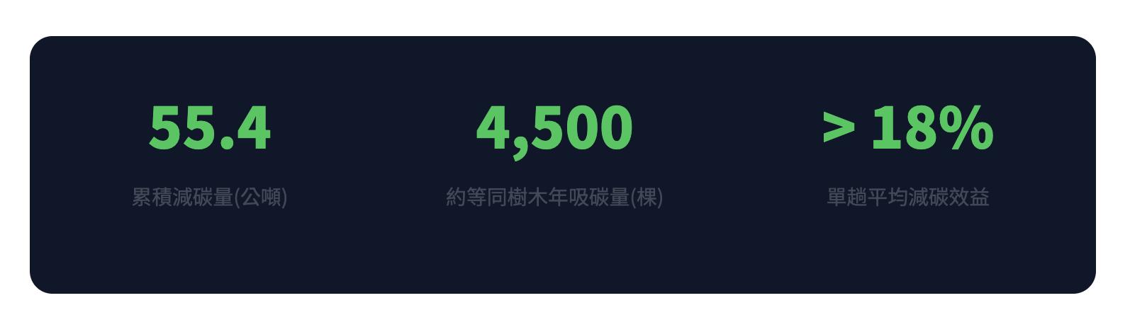 LINE GO 透過智慧派遣結構優化,已協助企業用戶減少近 55.4 公噸的碳排放。相較於企業員工使用自用車進行商務差旅,以 LINE GO 現有派遣結構下,整體平台單趟差旅平均減碳效益可達 18% 以上。